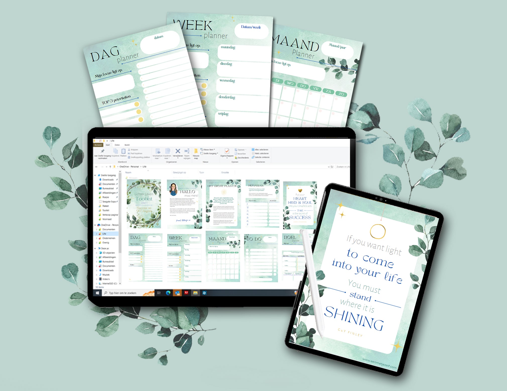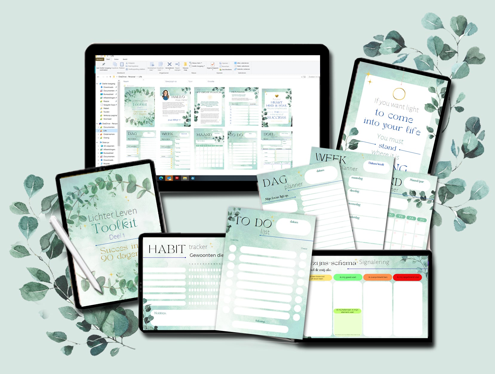 Meer dan 30 pagina's prachtig ontworpen planners, een tracker, een werkboek, checklists en inspiratie. Maak het jezelf makkelijk en leid een stressvrij, lichter en inspirerend leven.